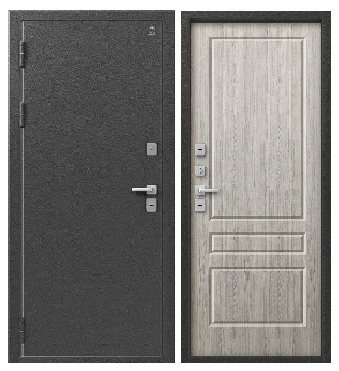 - Внешняя отделка выполнена в цвете Серебро антик, внутренняя — в оттенке седой дуб, что придаёт двери стильный и солидный внешний вид. Такое сочетание легко вписывается как в современный, так и в классический экстерьер.